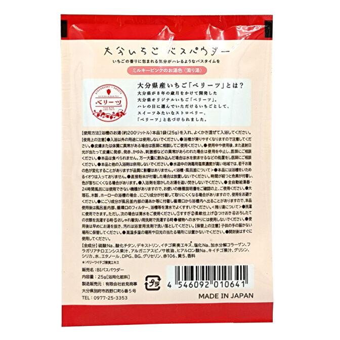 大分県産ブランドイチゴ「ベリーツ」を配合した入浴剤です。